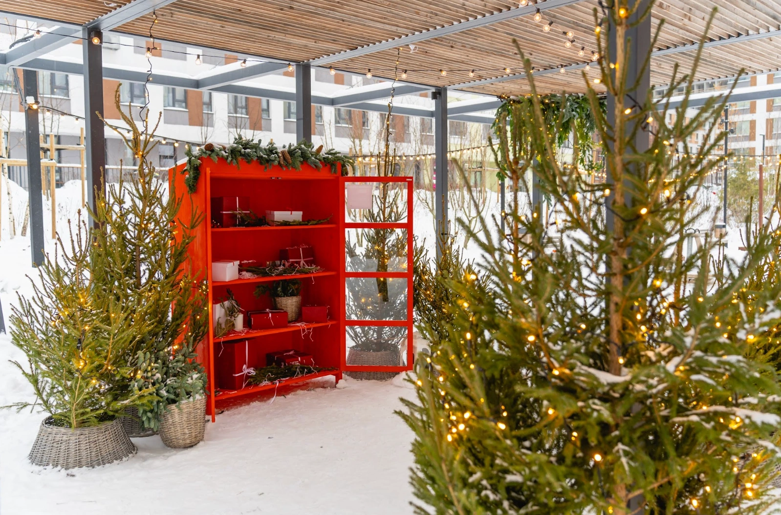 В перголе есть особая фотозона — красный шкаф с подарочными коробками. Это место, где вы можете принять участие в игре «Тайный Санта» и обменяться подарками с соседями и гостями квартала.